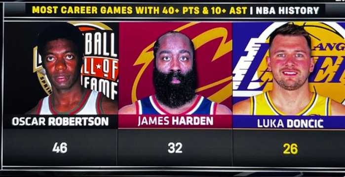 据统计,这是东契奇生涯第26场单场至少40分10助攻,历史第三多,仅次于大O和哈登。